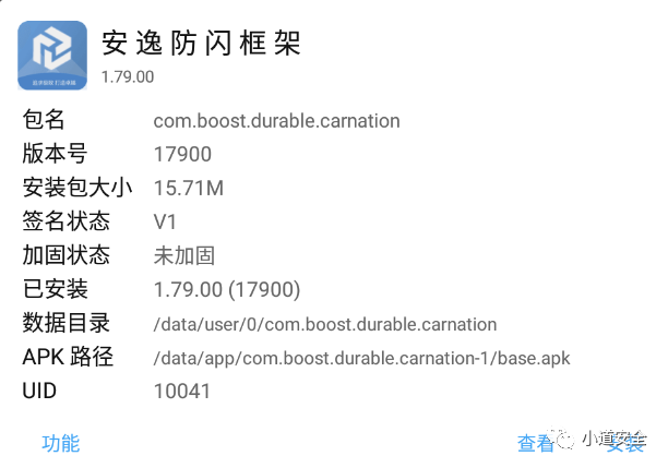 这个APP伪装成为一个安逸防闪框架,从界面展示实际上是一个作弊APP的集合,该APP也并没有采用市面上那些提供免费版本的加固厂商提供的加固或者开源的加固进行对核心功能的保护,实际上是没有什么核心功能。