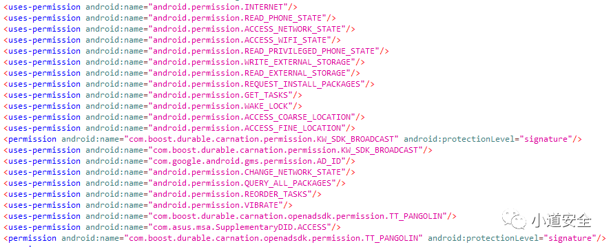 下面是该APP所申请的所有权限信息,通过这些权限信息可以大概知道APP大概会做哪些敏感的操作。