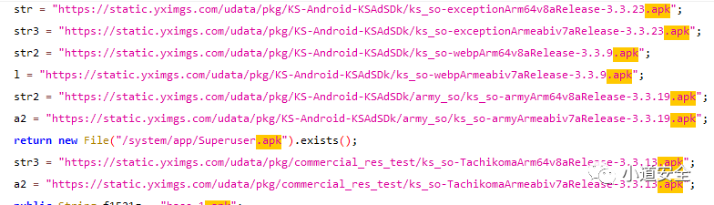 通过APP中的java代码部分(SO部分主要crash捕获还有推广的SO,没有其他过多功能),分析到该APP采用明文硬编码方式,通过固定链接进行下载并安装具有威胁性的APP。