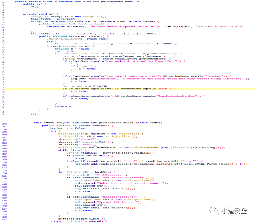 快手sdk中主要分为两部分一个是快手联盟的功能一个是访问设置拉取快手视频播放的功能,这里面主要集成了通过用特殊文件、特殊路径、特殊包名进行做识别检测运行是否在root环境下、是否有被xposed和frida注入