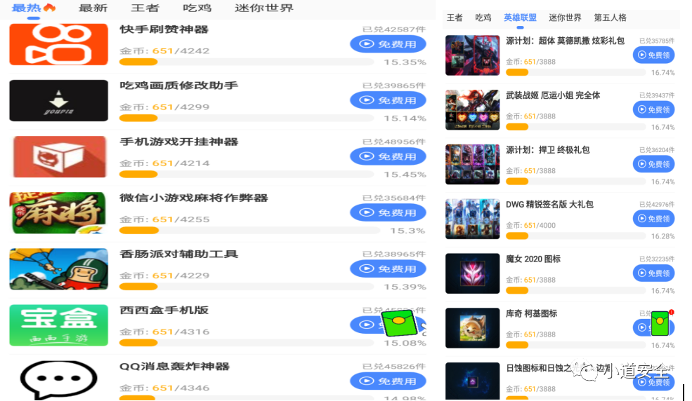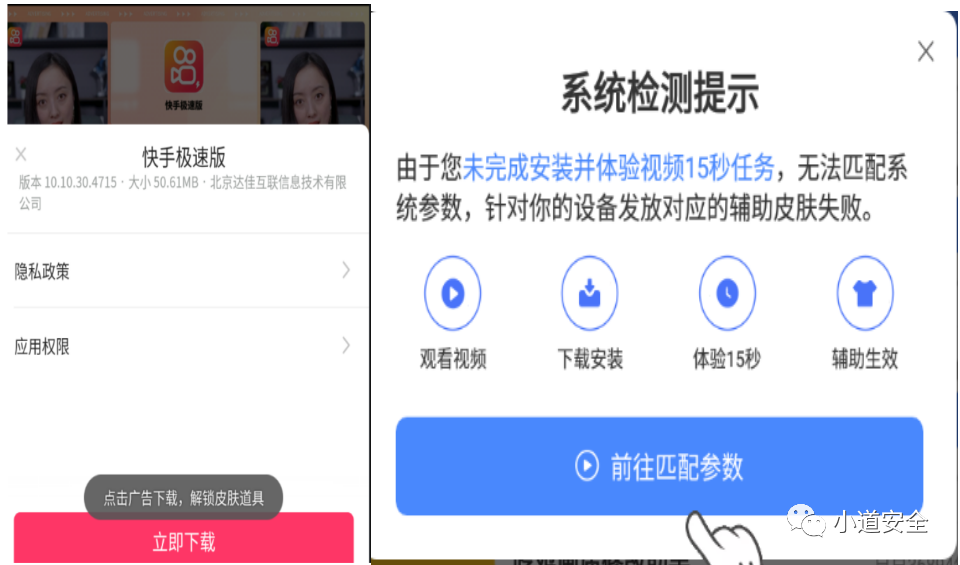 基于对APP的分析,想下载利用该黑产APP所展示的那些具有作弊功能的APP,需要先看15秒的快手联盟广告视频,还有要下载注册使用15秒以上捆绑在视频中的APP应用。通过这一系列的事情后才能获取都网络搬运收集集成的那些可以作弊的APP应用。