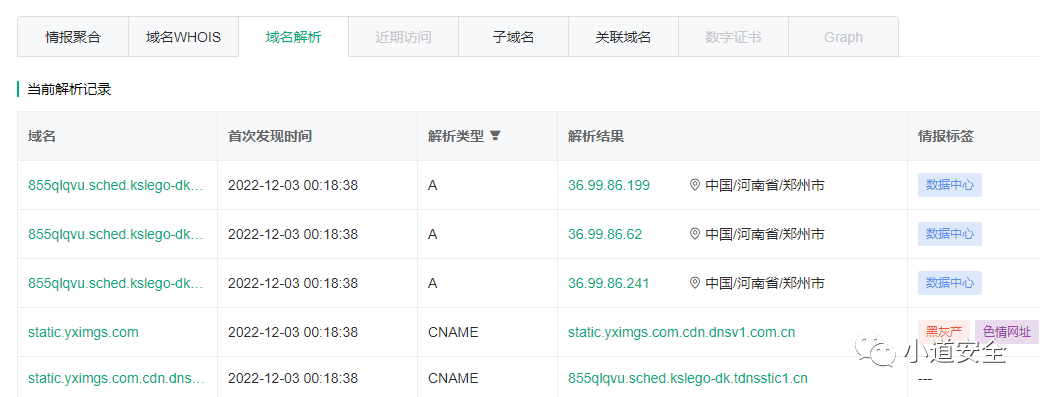 通过360威胁情报中心 https://ti.360.cn/#/homepage 进行查询,可以通过下图看到该域名已经被检测出属于黑灰产信息并且具有不良的信息的标识了。