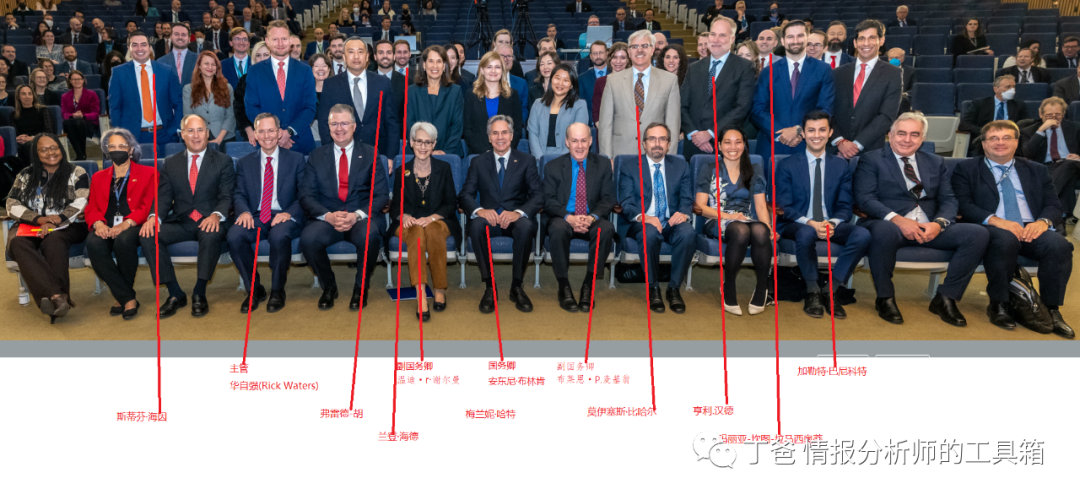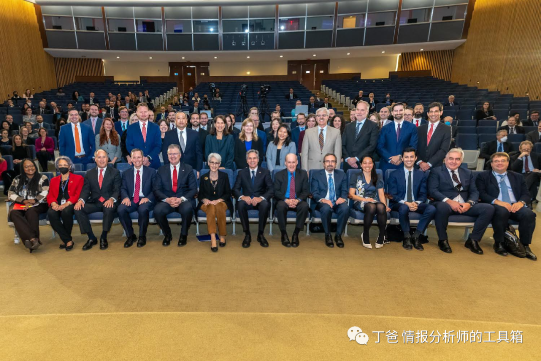 在布林肯的推特中上传了几张与“中国之家”成立相关的照片,其中一张是合影: