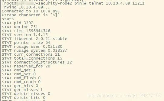 telnet 10.10.4.89 11211# 或者nc -vv 11211使用了 stats 命令来输出 Memcached 服务信息