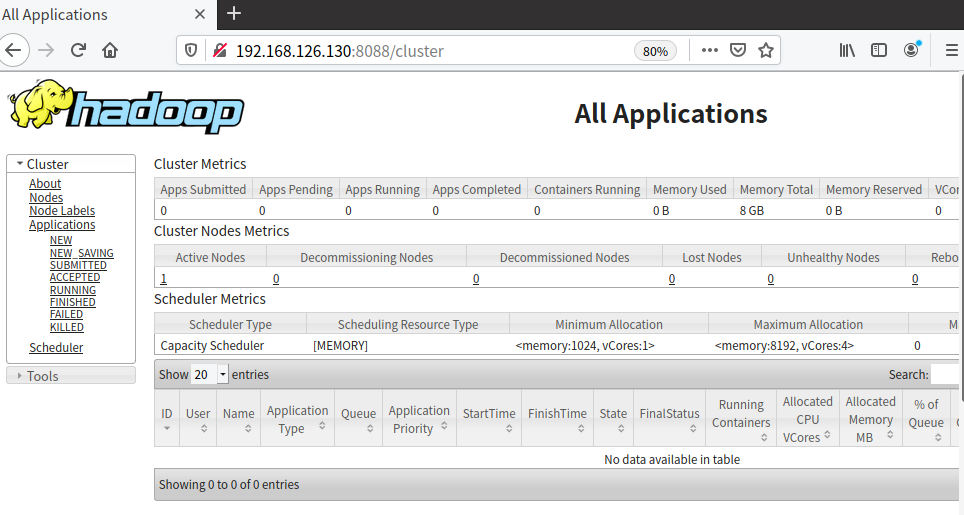 cd /vulhub/hadoop/unauthorized-yarndocker-compose up -d环境启动后,没有配置身份认证,可以未授权访问到Hadoop YARN ResourceManager WebUI页面。