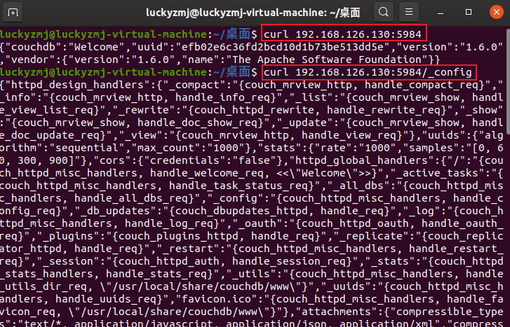 curl 192.168.126.130:5984curl 192.168.126.130:5984/_config指定CouchDB绑定的IP (需要重启CouchDB才能生效)在 /etc/couchdb/local.ini 文件中找到 “bind_address = 0.0.0.0” ,把 0.0.0.0 修改为 127.0.0.1 ,然后保存。 注:修改后只有本机才能访问CouchDB。