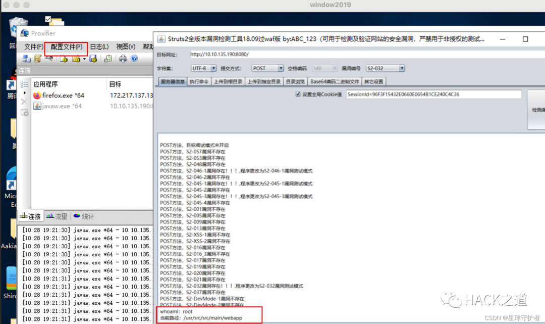 配置代理,通过proxifer配置socks5代理,把电脑代理到内网,然后使用struts2工具去探测内网漏洞