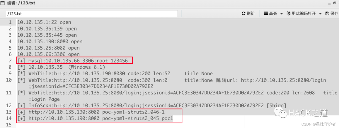 10.10.135.1:22 open10.10.135.35:139 open10.10.135.35:445 open10.10.135.190:8080 open10.10.135.25:8080 open10.10.135.66:3306 open[+] mysql:10.10.135.66:3306:root 123456[*] 10.10.135.35 (Windows 6.1)[*] WebTitle:http://10.10.135.190:8080 code:200 len:52 title:None[*] WebTitle:http://10.10.135.25:8080 code:302 len:0 title:None 跳转url: http://10.10.135.25:8080/login;jsessionid=ACFC3E30347DD234AF1E730D02A792E2[*] WebTitle:http://10.10.135.25:8080/login;jsessionid=ACFC3E30347DD234AF1E730D02A792E2 code:200 len:2608 title:Login Page[+] InfoScan:http://10.10.135.25:8080/login;jsessionid=ACFC3E30347DD234AF1E730D02A792E2 [Shiro][+] http://10.10.135.190:8080 poc-yaml-struts2_046-1[+] http://10.10.135.190:8080 poc-yaml-struts2_045 poc1
