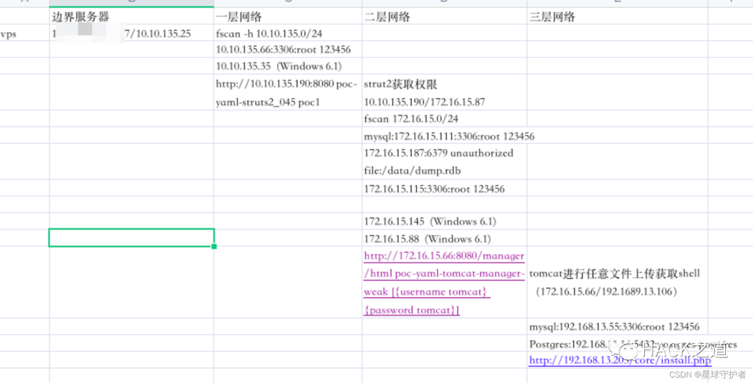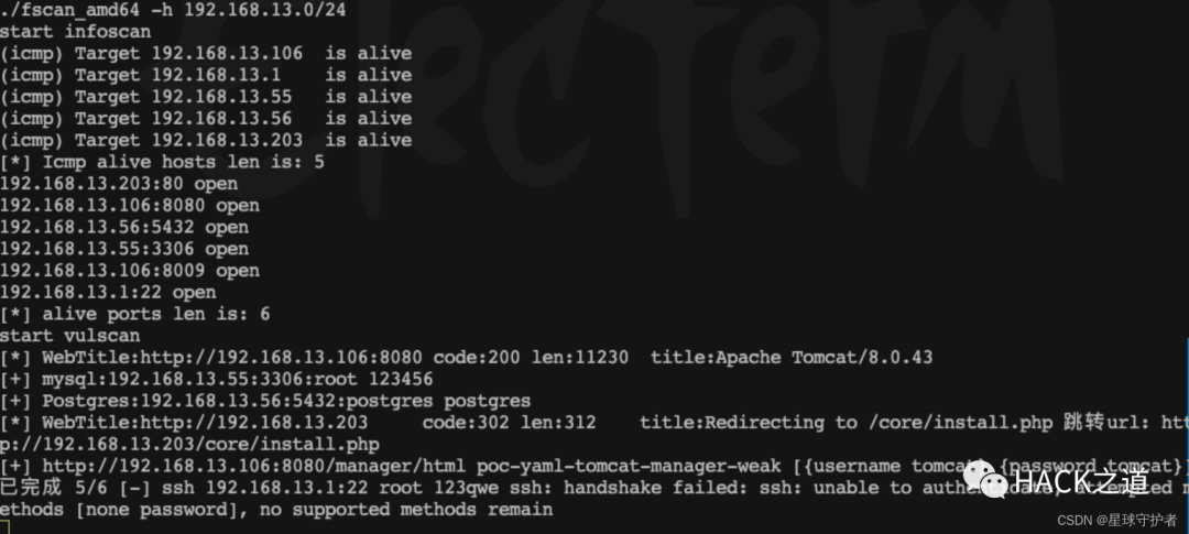 ./fscan_amd64 -h 192.168.13.0/24start infoscan(icmp) Target 192.168.13.106 is alive(icmp) Target 192.168.13.1 is alive(icmp) Target 192.168.13.55 is alive(icmp) Target 192.168.13.56 is alive(icmp) Target 192.168.13.203 is alive[*] Icmp alive hosts len is: 5192.168.13.203:80 open192.168.13.106:8080 open192.168.13.56:5432 open192.168.13.55:3306 open192.168.13.106:8009 open192.168.13.1:22 open[*] alive ports len is: 6start vulscan[*] WebTitle:http://192.168.13.106:8080 code:200 len:11230 title:Apache Tomcat/8.0.43[+] mysql:192.168.13.55:3306:root 123456[+] Postgres:192.168.13.56:5432:postgres postgres[*] WebTitle:http://192.168.13.203 code:302 len:312 title:Redirecting to /core/install.php 跳转url: http://192.168.13.203/core/install.php[+] http://192.168.13.106:8080/manager/html poc-yaml-tomcat-manager-weak [{username tomcat} {password tomcat}]已完成 5/6 [-] ssh 192.168.13.1:22 root 123qwe ssh: handshake failed: ssh: unable to authenticate, attempted methods [none password], no supported methods remain已完成 5/6 [-] ssh 192.168.13.1:22 root Aa123456! ssh: handshake failed: ssh: unable to authenticate, attempted methods [none password], no supported methods remain已完成 5/6 [-] ssh 192.168.13.1:22 admin [email protected]#4 ssh: handshake failed: ssh: unable to authenticate, attempted methods [none password], no supported methods remain