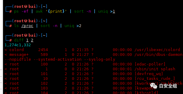 ps -ef | awk '{print}' | sort -n | uniq >1ls /proc | sort -n | uniq >2diff 1 2
