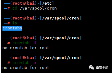 /etc/crontab/var/spool/cron/[用户名]crontab -l //查看计划任务crontab -r //删除计划任务