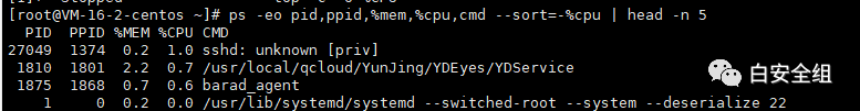 ps -eo pid,ppid,%mem,%cpu,cmd --sort=-%cpu | head -n 5查看网络通信的情况