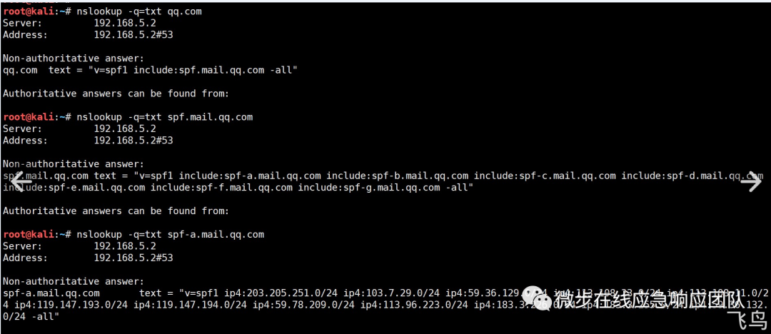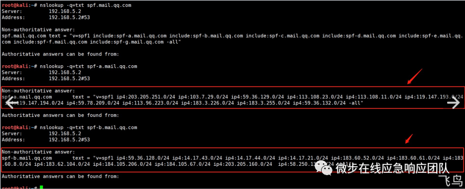 下面就是mail.qq.com的邮件服务器IP地址,其是一个地址集,如果发件人的IP地址在这些IP中,根据SPF校验其就是合法的IP地址;不过这里面同样存在被绕过的可能,所以邮件网关类产品不仅仅会校验这块的安全,还有更深层次的校验。