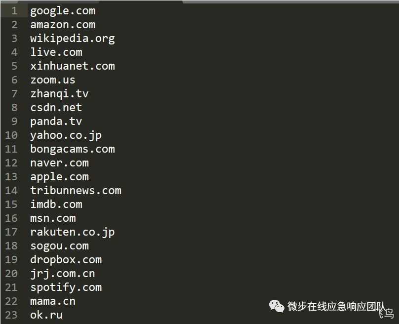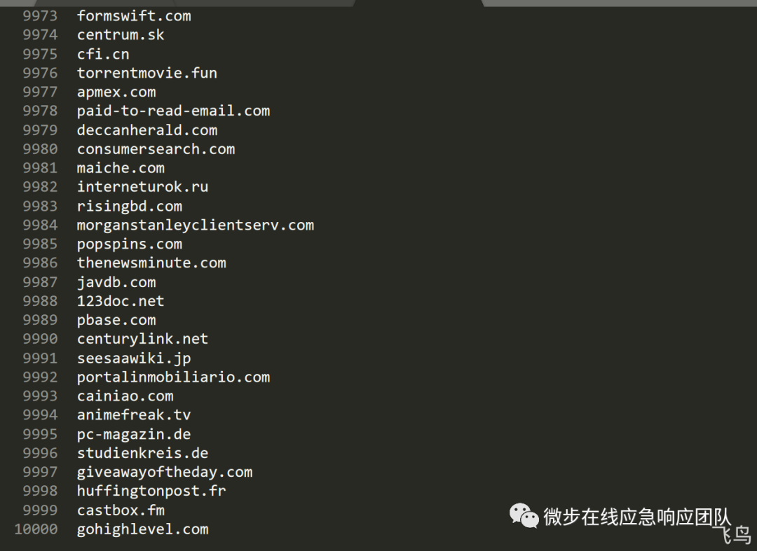 跑完数据,看一下结果,top一万的域名里面有593个域名没有配置dns的txt记录,占比例为593/10000=5.9%,比例还是很高的,并且这些域名都是全球排名前一万的,相关数据如下: