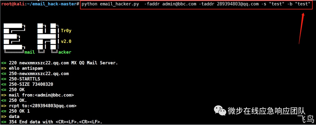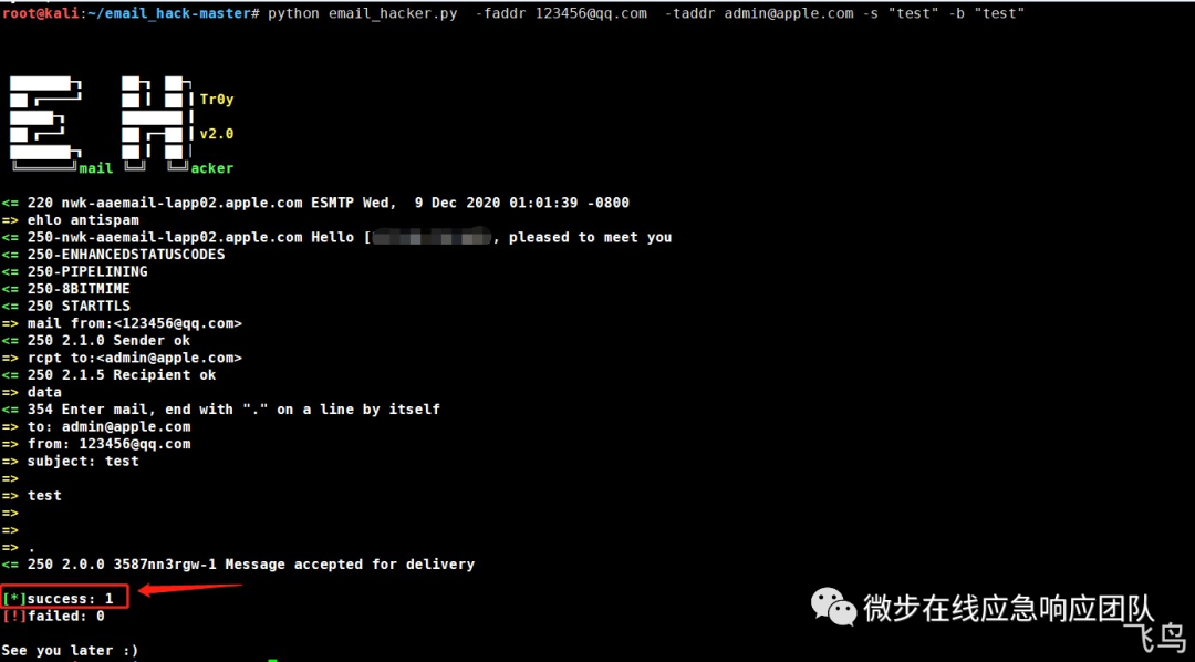 伪造一个发试试,直接伪造qq.com发给apple.com,竟然发送成功了。这里面由于没有apple.com邮箱,所以没有测试。