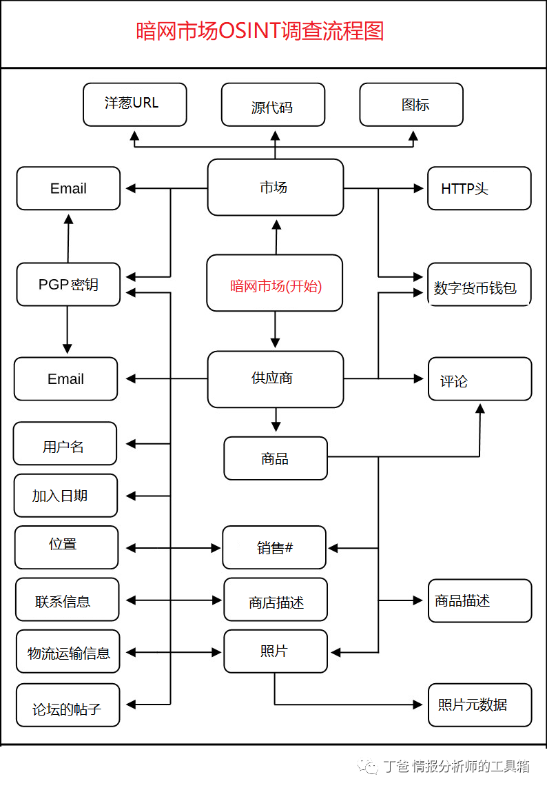 今天给大家推送暗网市场开源情报调查流程图:现在很多犯罪团伙都在使用暗网来规避监管和治理。因此,情报分析师也越来越多的需要在暗网中开展调查。上图将如何在暗网市场开展调查进行了展示。主要围绕市场网页的网址