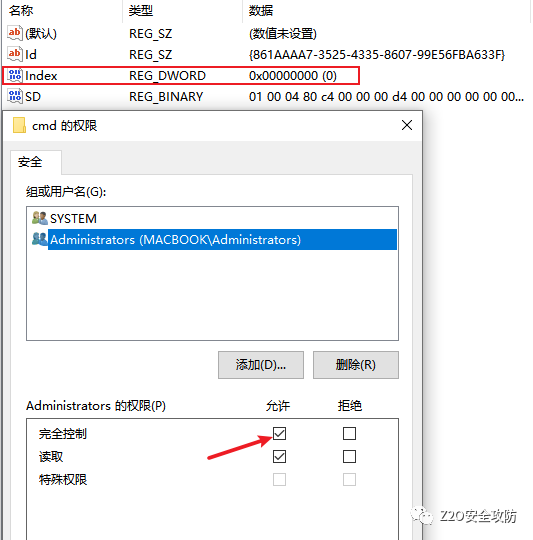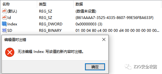 获取特权模式后,更改注册表项值的所有者为 Administrators,同时要更改注册表项值的权限,这才能对 Index 进行修改操作。