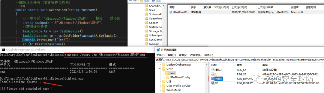 }修改注册表中的键值 Index 与 SD 后,任务计划程序中就查看不到该任务。通过 TaskCollection 也无法查到此任务,就无法删除所创建的计划任务。