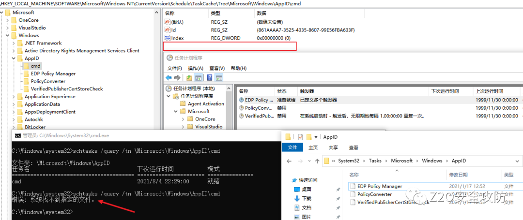 这样操作,无论何种方式 (排除注册表) 都查不到该任务,较为彻底。因为 SD 就是安全描述符,它的作用主要是为了给操作系统提供判断来访对象的权限,但被删除后,无法判断用户是否有权限查看该任务信息,导致系统直接判断无权限查看。因此在使用 schtasks /query /tn \Microsoft\Windows\AppID\cmd 查询时,提示“错误: 系统找不到指定的文件”。