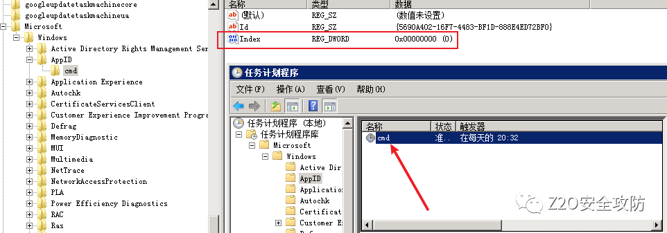 }通过修改 HKLM\SOFTWARE\Microsoft\Windows NT\CurrentVersion\Schedule\TaskCache\Tree\{TaskName} 下对应任务的 Index 值为 0后,利用 taskschd.msc、schtasks.exe 、API 都查看不到所创建的任务。