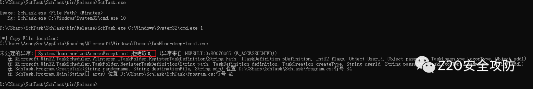 首先需要更改注册表对应计划任务项值的高级安全设置中的所有者。在未获取特权模式下,工具运行后提示“拒绝访问”,这显然是权限不足。