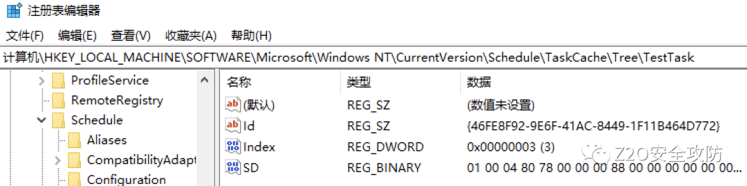 计算机\HKEY_LOCAL_MACHINE\SOFTWARE\Microsoft\Windows NT\CurrentVersion\Schedule\以 Windows 10 为例,查看刚才所创建任务计划的键值,路径:计算机\HKEY_LOCAL_MACHINE\SOFTWARE\Microsoft\Windows NT\CurrentVersion\Schedule\TaskCache\Tree\TestTask
