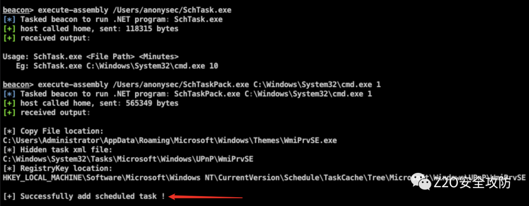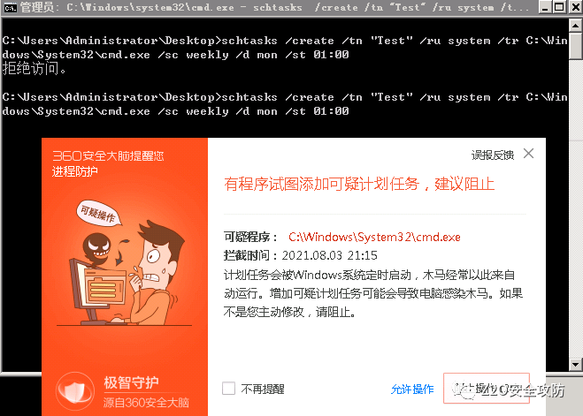如果主机存在安全软件,计划任务的创建会被阻止,命令行无法成功创建。(可通过 计划任务API 绕过,工具化利用此点)