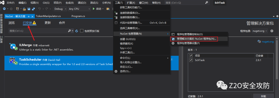 编写任务计划的工具,需要用到任务计划API:Microsoft.Win32.TaskScheduler.dll。在 Visual Studio 中,可以直接从NuGet程序包中安装获取。
