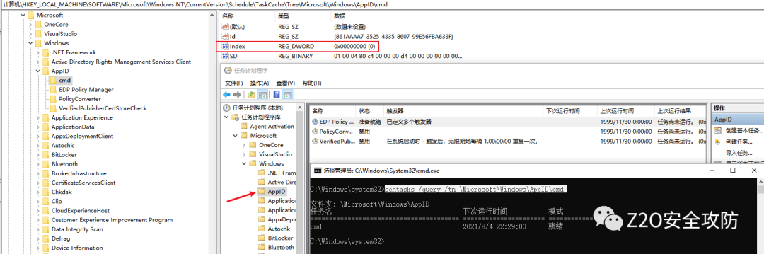 当 Index 修改为 0 后, 利用 taskschd.msc、schtasks.exe 、甚至系统API查询出的所有任务中,都查看不到所创建的任务。但如果知道该任务名称,可以通过 schtasks /query /tn {TaskName Path} 查到。