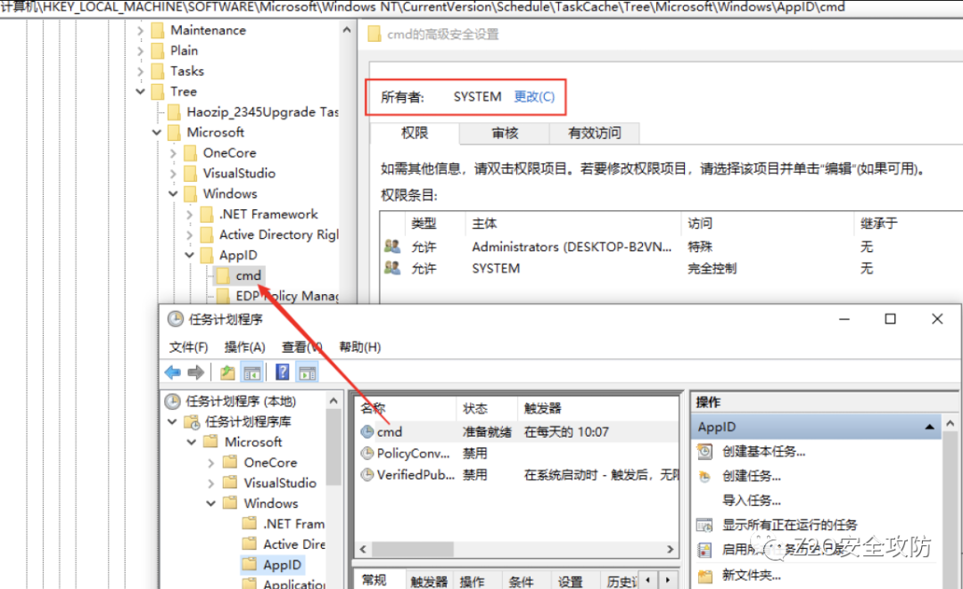 以 Windows 10 为例,新建计划任务 cmd 的高级安全设置中所有者为 SYSTEM,默认无法更改注册表键值。