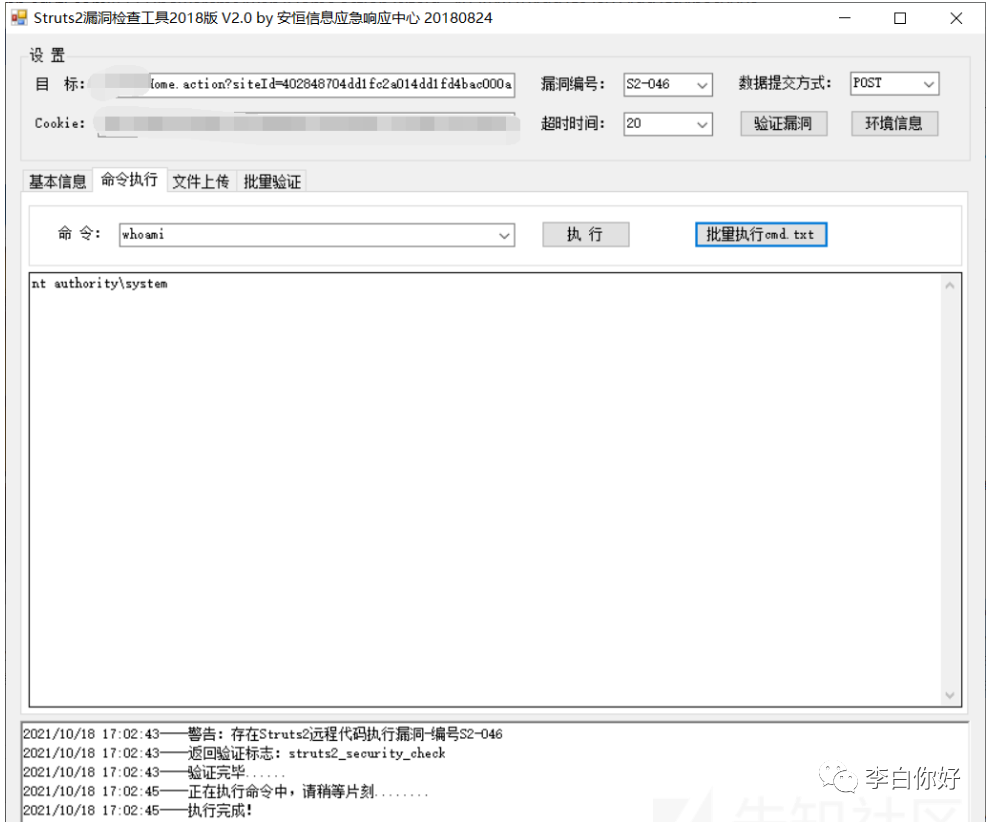 登录之后,点击点一个系统进行查看,因为后台挂着xray,检测到了struts远程代码执行,借助工具进行验证,验证成功,可以执行系统命令。