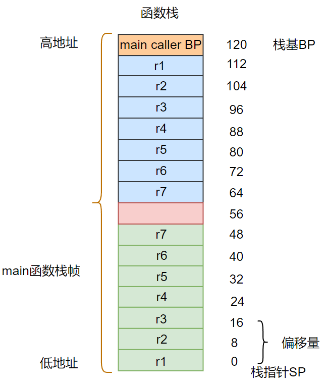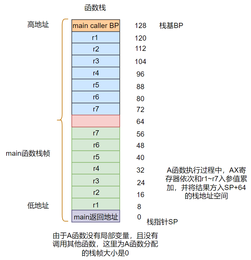 SP+64~SP+112 指向的56个栈空间,存储的是r1~r7这7个main函数的局部变量;SP+56 该地址接收函数A的返回值;SP~SP+48 指向的56个字节空间,用来存放A函数的 7 个入参。
