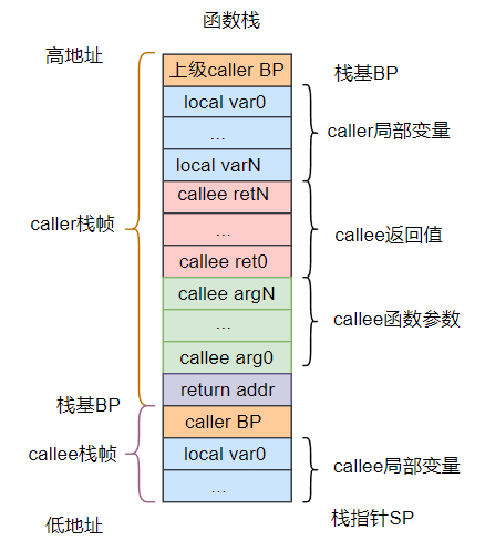 分配给一个个函数的栈空间被称为“函数栈帧”。Go语言中函数栈帧布局是这样的:先是调用者caller栈基地址,然后是调用者函数caller的局部变量、接着是被调用函数callee的返回值和参数。然后是被调用者callee的栈帧。