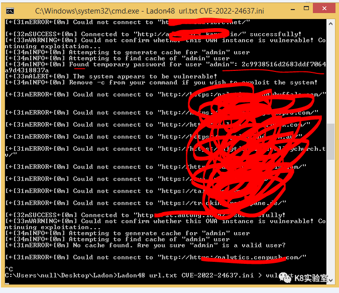 由于本地没搭有环境,EXP也是github上找的,并不知道成功是怎样的,所以没有重定向,先让Ladon跑一些URL,成功如上图所示,检测出漏洞时同时返回密码HASH,当然也有一些有漏洞但无法获取HASH的。重定向后,稍等一分钟,就自动获取了12个密码。