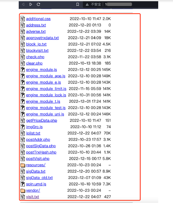特征一:钓鱼网站都会记录访客数据并保存到外部站点。黑客通过 HTTP GET 请求将站点访问者信息记录到外部域,发送请求的域名虽不同但是请求的 API 接口都为 “/postAddr.php”。一般格式为 “https://nserva.live/postAddr.php?mmAddr=...[Metamask]...&accessTime=xxx&url=evil.site”,其中参数 mmAddr 记录访客的钱包地址,accessTime 记录访客的访问时间,url 记录访客当前所访问的钓鱼网站链接。