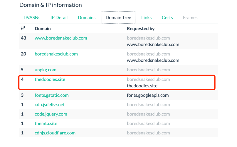 进一步分析发现 APT 用于监控用户请求的主要域名为 “thedoodles.site”,此域名在 APT 活动早期主要用来记录用户数据: