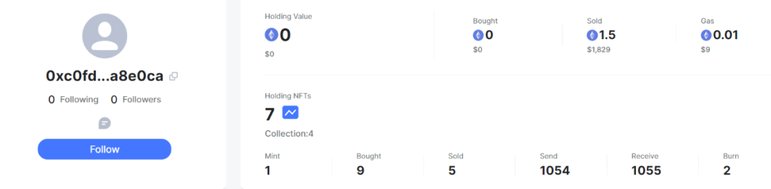 可以看到这个地址已被 MistTrack 标记为高风险钓鱼地址,交易数也还挺多。钓鱼者共收到 1055 个 NFT,售出后获利近 300 ETH。