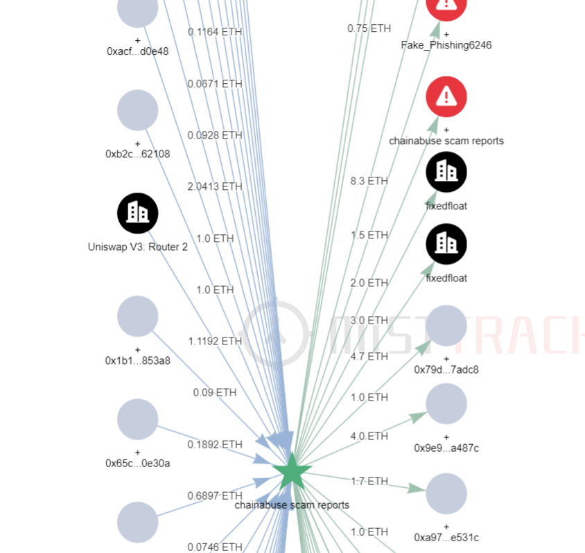 往上溯源,该地址的初始资金来源于地址(0x2e0a...DA82)转入的 4.97 ETH。往下溯源,则发现该地址有与其他被 MistTrack 标记为风险的地址有交互,以及有 5.7 ETH 转入了 FixedFloat。