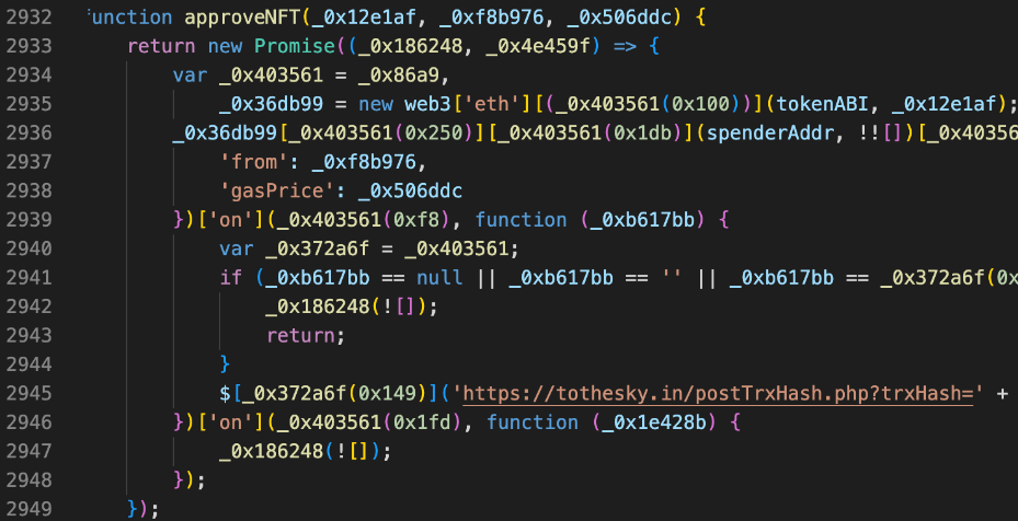 下面代码用于诱导受害者进行授权 NFT、ERC20 等较常见的钓鱼 Approve 操作: