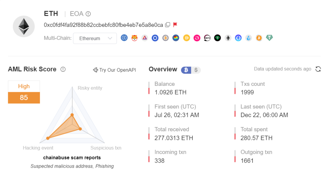 对钓鱼网站及手法分析后,我们选取其中一个钓鱼地址(0xC0fd...e0ca)进行分析。