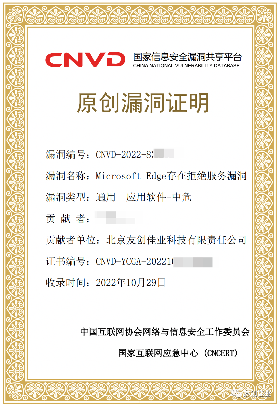 前言友创佳业安服团队发现微软Microsoft Edge浏览器存在0day漏洞,本次漏洞预警不公布漏洞细节,以防被恶意利用,请用户保持版本更新,勿点击不明链接。相关漏洞已经提交CNVD(国家信息安全漏