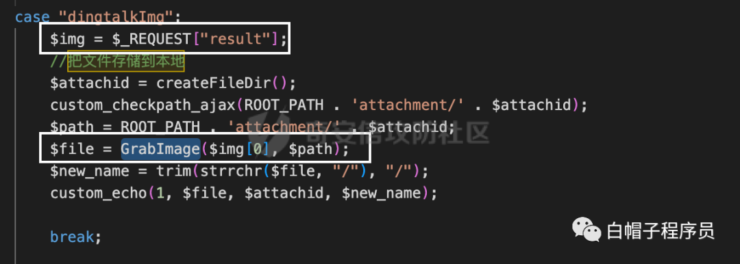 还是这个文件,继续分析action为其他的分支,在action=dingtalkImg时,存在该漏洞,我们看下实现过程: