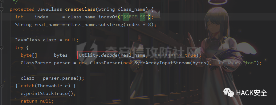 这里我们说,我们是通过loadClass下重写的方法来执行的,其中有个defiClass 显然是通过字节码来实现的。再回过头看createClass中的Utility.decode