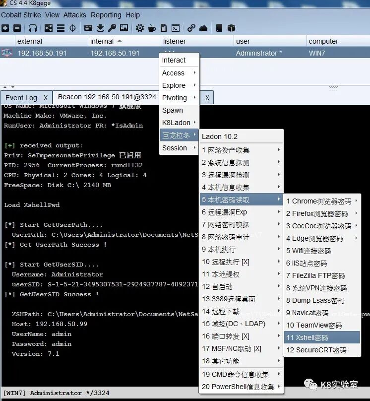 加载ladon的cna脚本后,Cobalt Strike右键菜单点击就可内存加载XshellPwd模块读取密码,整个过程不会有Ladon文件出现在目标电脑。
