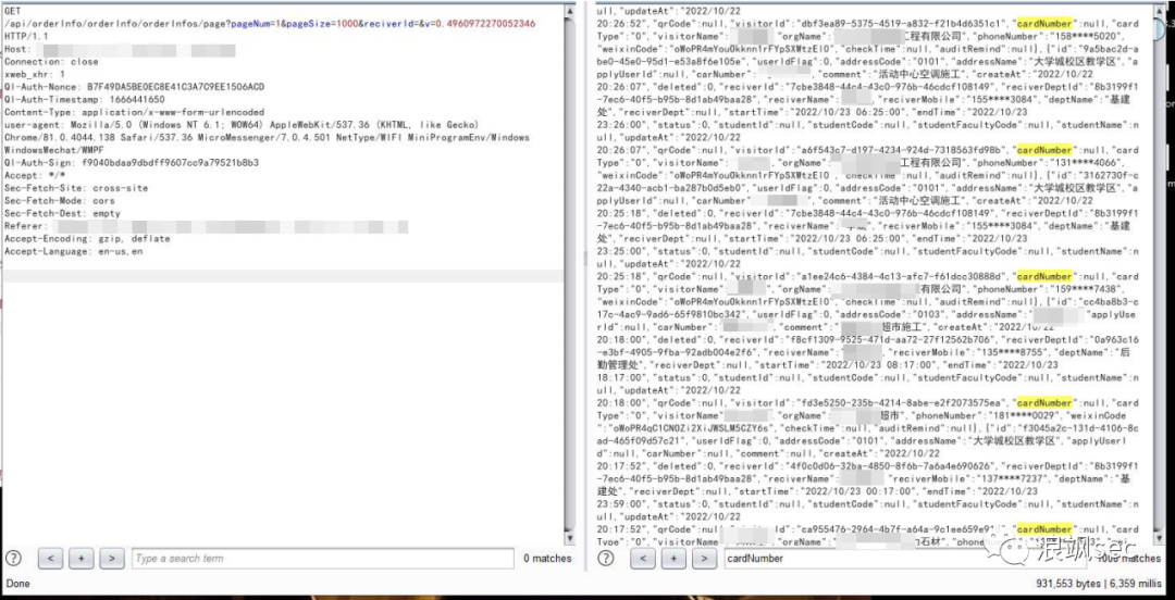 在对小程序的每个功能进行抓包的时候,发现在点击访客系统的时候,response包中的code字段跟着时间和userid等不该出现在response包的字符。